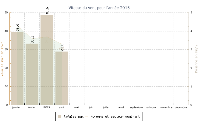 | avril | -0.5 °C | 4.7 °C | 25.5 °C | 16.9 °C | 10.5 °C | 3.3 km/h | 28.8 km/h | NNO |